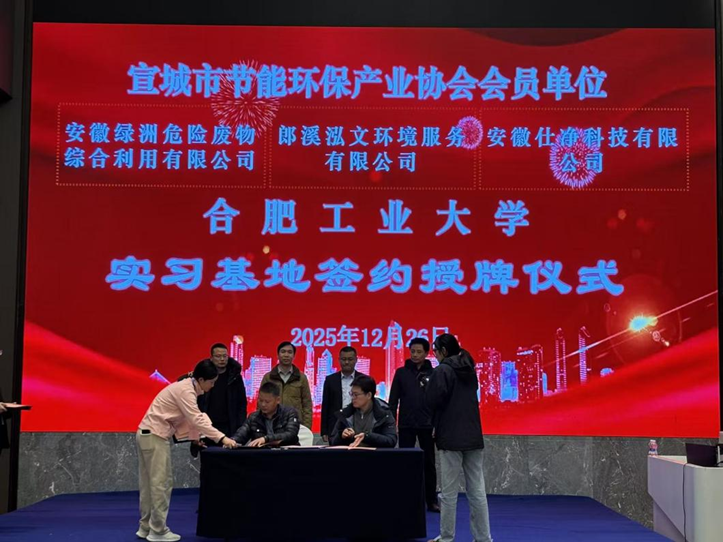 在与会嘉宾的共同见证下,王世伟与安徽绿洲危险废物综合利用有限公司、郎溪泓文环境服务有限公司和安徽仕净科技有限公司进行了《大学生实践教学基地合作协议》签约并合影留念。